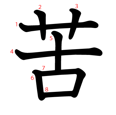 苦は、苦しい / 苦い / 苦々しいなどの意味を持つ漢字です。